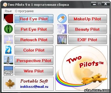![]() Портативная сборка, состоящая из девяти программ для работы с цифровыми изображениями от компании Two Pilots. При помощи этой сборки Вы сможете без труда улучшить качество Ваших цифровых фотографий.Каждая из программ,входящих в сборку, имеет демонстрационные примеры, большинство программ имеет справку на русском языке. Red Eye Pilot - быстрое и качественное удаление эффекта красных глаз с цифровых изображений. Программа позволяет регулировать область обработки и яркость цвета глаз. Имеется окно предварительного просмотра. Pet Eye Pilot - быстрое и качественное удаление эффекта цветных глаз с цифровых изображений животных.