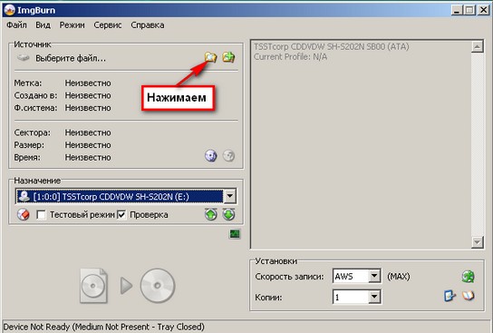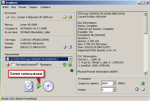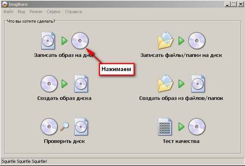 Для этого скачиваем эту(у кого нет) программу для записи нашего образа на диск. Cкачать ImageBurner.