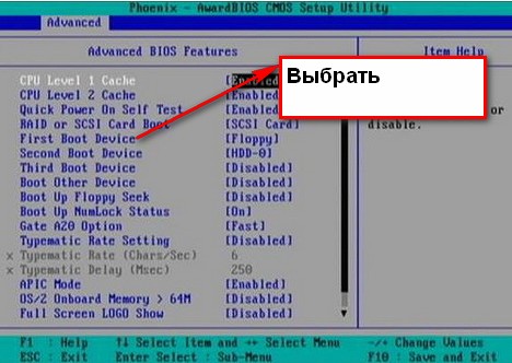 Навигация в «Bios» осуществляется при помощи клавиш «Вверх», «Вниз», «Вправо», «Влево» (кнопки со «стрелками» на клавиатуре), которыми передвигается курсор (выделение разделов), и клавиш «Enter» и «Esc» (выбор и отмена выбора выделенного раздела или пункта соответственно). Пользуясь клавишами навигации, в «Bios» необходимо указать в качестве источника для загрузки CD-привод. Для этого нужно найти пункт «First Boot Deviсе» (или «1st Boot Deviсе») и указать для него значение «CD-ROM». Структура разных версий «Bios» отличается, поэтому название раздела, в котором находится «First Boot Deviсе», на разных компьютерах тоже может отличаться. Но просматривая поочередно все разделы «Bios», этот пункт найти не сложно. (Внимание!!! Значения других параметров «Bios» менять не следует, если Вы не уверены в правильности своих действий).